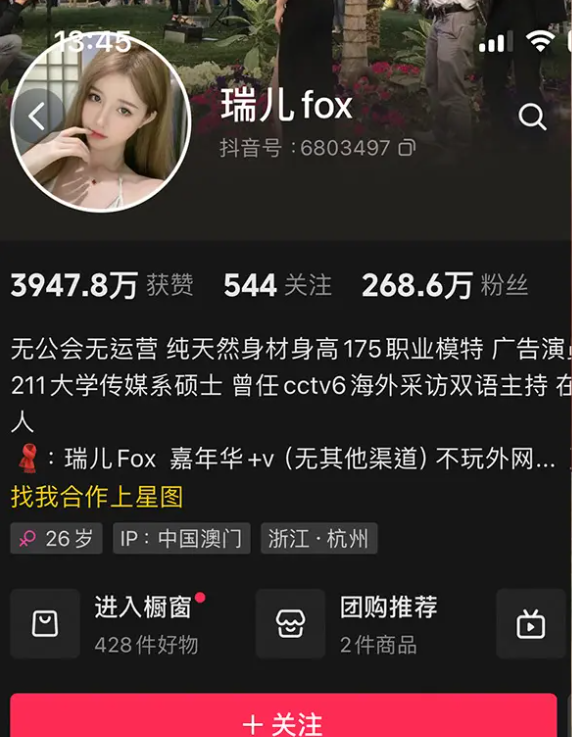 抖音号:6803497,IP属地:中国澳门,26岁,浙江·杭州,纯天然身材身高175职业模特,211大学传媒系硕士,曾任cctv6海外采访双语主持,在职艺人,微博::瑞儿Fox 嘉年华+v (无其他渠道)不玩外网均为冒充我。